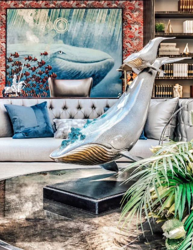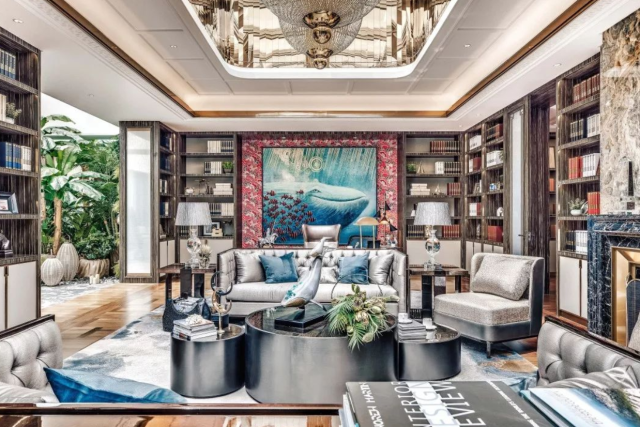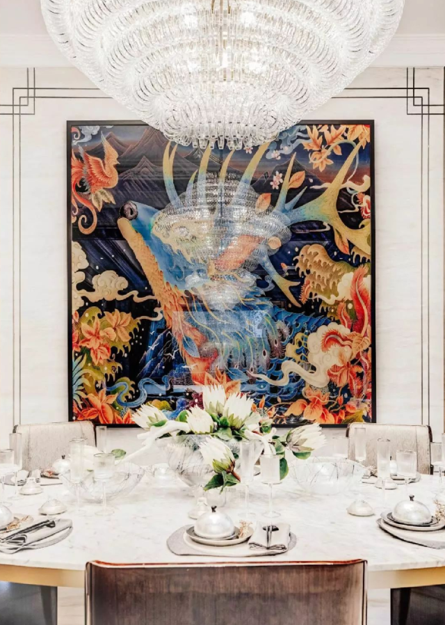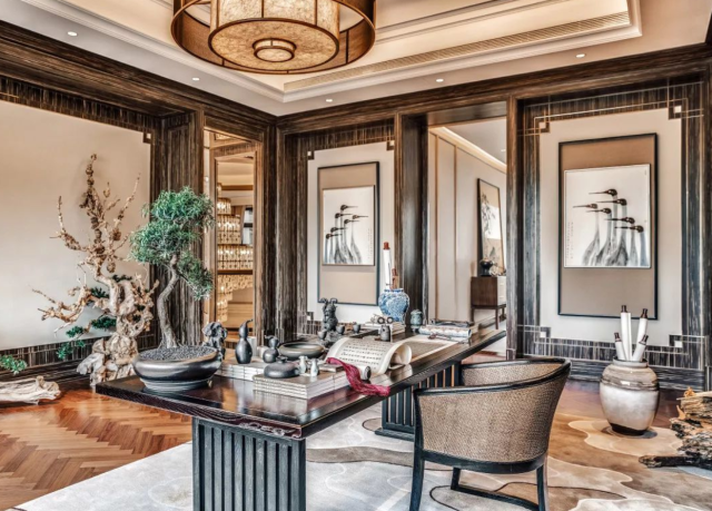 以私董会为主题的“天煜”样板间,借助“礼玉六器、六博棋、石湾陶瓷、黄绢本兰亭序”等中国传统文化载体,为现代空间注入了凝练唯美的古典情韵,呈现出一种更富活力、更具生命力、更有温度与时尚感的新中式空间美学。