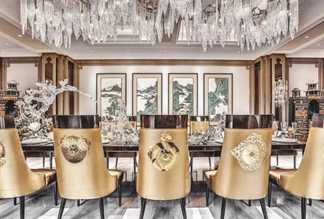 礼玉的图案又有着不同的寓意,如:乳丁纹、云纹、兽面纹、龙纹、螭纹、鸟纹等,将礼玉六器的纹样用在西餐厅椅背的刺绣上,表达了隆重而又极富文化意蕴的仪式感。