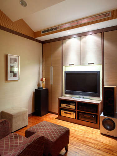 编辑推荐:屋主对音响视听器材的品质相当讲究,所以在视听室的配置上设计师也很用心,例如像天花板选用折板,可使音频有效传递且具制造音效环绕效果,墙壁部分全都规划吸音材质的壁面,可以充分展现音响完整音质。