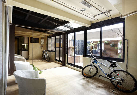 编辑推荐:衔接在露台区后方的仿木纹地砖晒衣间,还可兼作健身房,大面的茶镜墙不仅可以作为健身辅助之用,更可把储物间隐藏于无形。