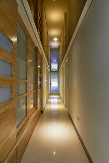 编辑点评:为了保留各卧房的收纳容量以茶镜铺饰长廊天花,由镜面的放大折射转移,减少天花造成的空间压迫感。