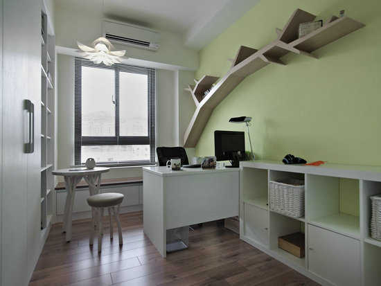 编辑点评:清新的芥末绿墙面,延续自然元素,树枝状的壁面造型,是置物架也是房间的视觉主题。