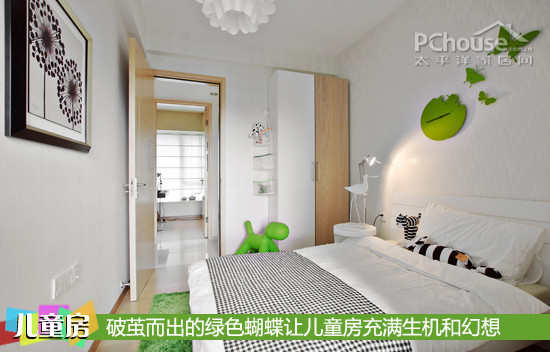 ▲起舞的床头背景墙:儿童房只在床头背景墙上贴了浅灰色纹理的墙纸,设计师放弃惯有的挂装饰画的手法,改挂上三只破茧而出的绿色蝴蝶,让儿童房充满生机和幻想。