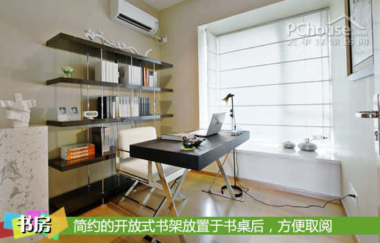 ▲简约书架:书房一般是男主人公使用得较多,因此整体设计比较阳刚。一排简约的开放式书架放置于书桌后,方便取阅,缺点是不防尘,要经常擦洗。
