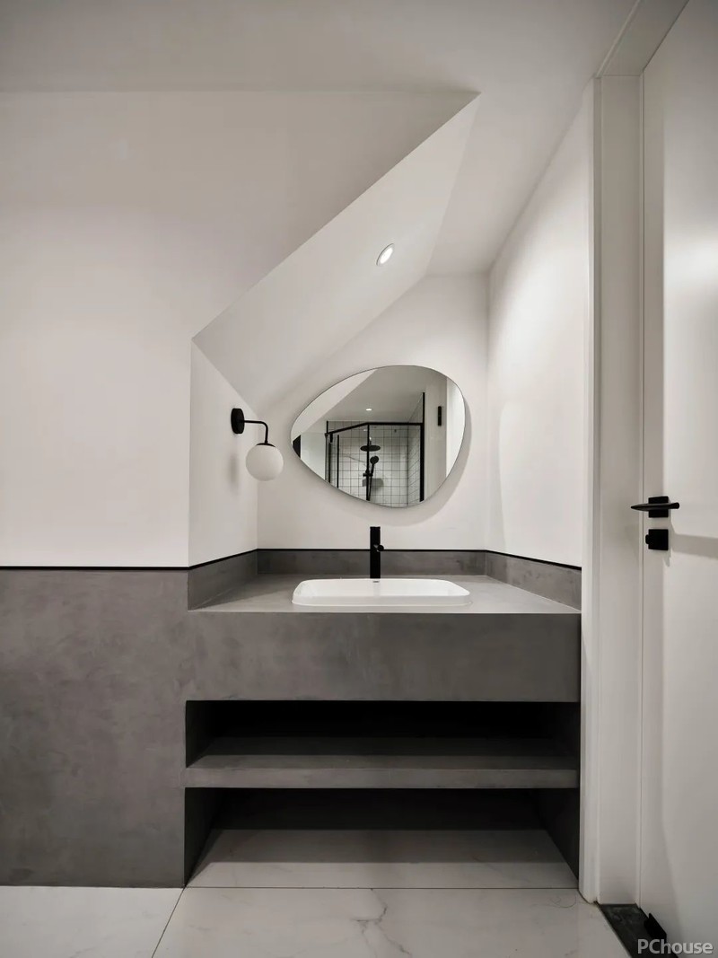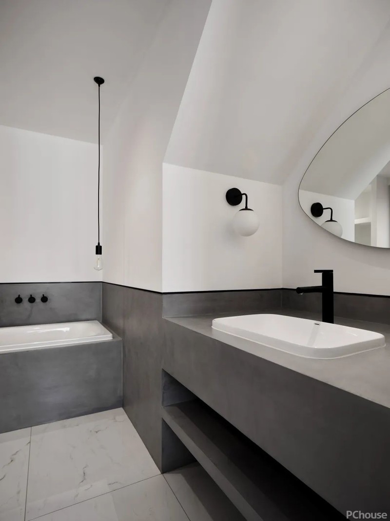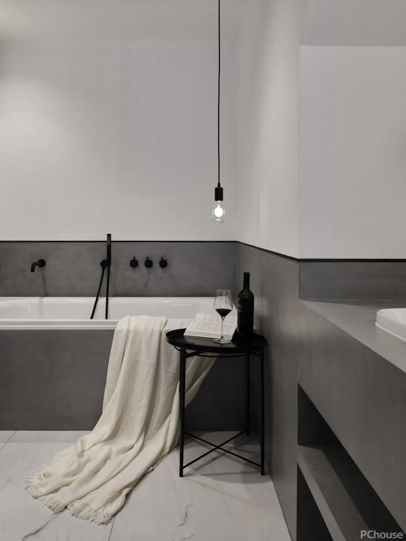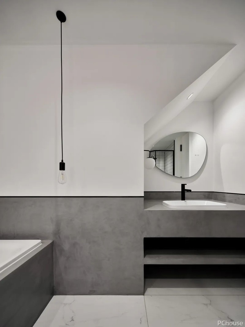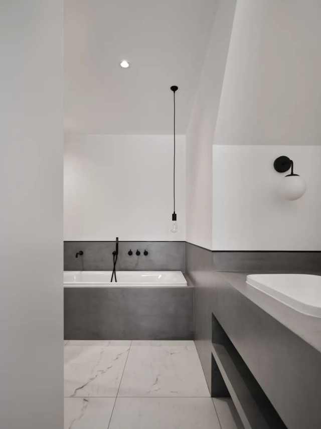 空间中几乎所有墙面都是白色,辅以灰色地板和黑色的暗踢脚,营造出沉静、克制的氛围。