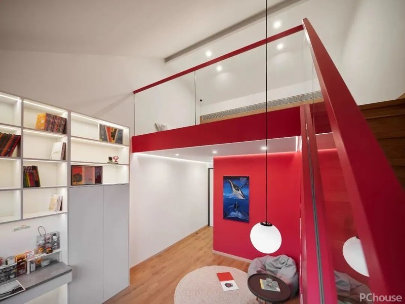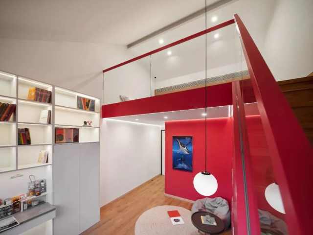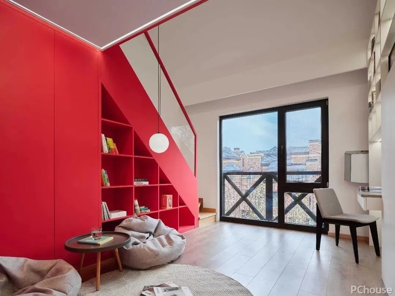 不同于主色调的冷冽,女儿房间中则采用大面积的红色,鲜活、炽烈、元气满满。热情与纯粹相得益彰,颜值与收纳兼具。上方是安静的休息区域,下方则是学习、游戏的快乐天地。