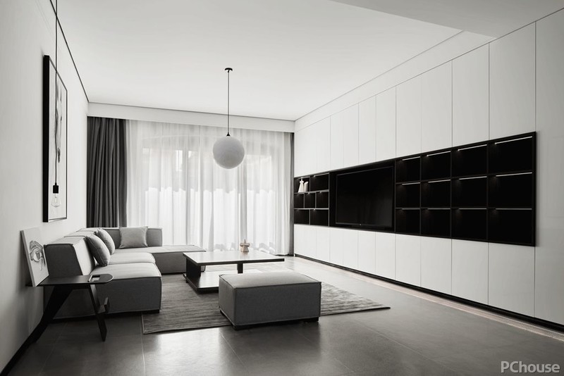 黑与白组合而成的电视背景墙,同时具备超强的展示与收纳功能。