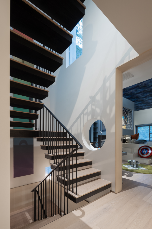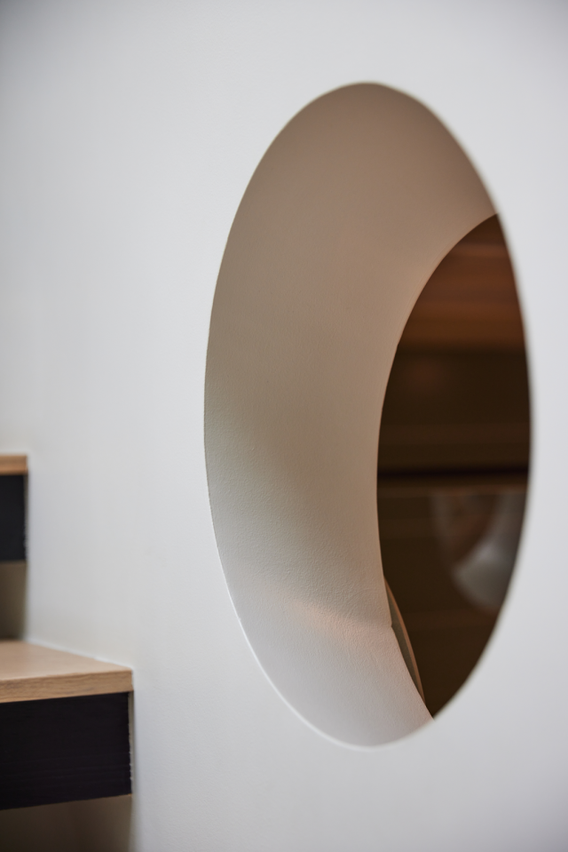 在楼梯转角处,开一处天窗,再引一束侧光,设计更像是抛砖引玉,从顶部到侧光的引入,为人与自然,室内与室外开双向链接,得不同的美妙。阴影明暗变化,家的肌理细节丰富,与人产生了对话,生发了光阴的故事。