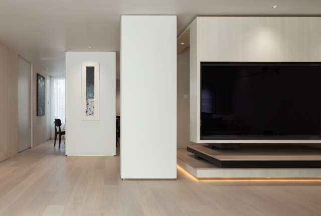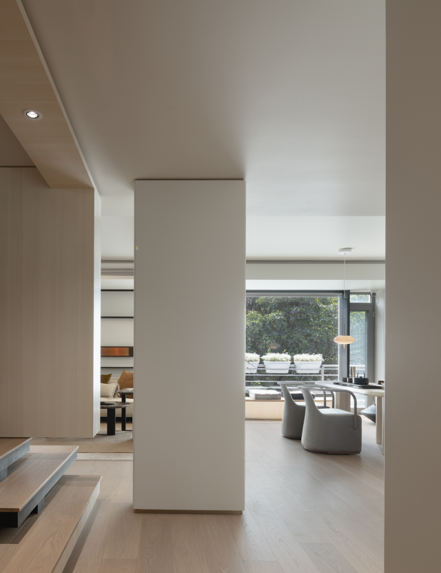 在横向空间维度上,将自然景致与天光最大限度引入空间,是设计和生活的一致目标。于是,建筑原有的阻碍全部消除,一镜到底的通透,在视觉上放大了空间,成为初入家空间最大的体感。