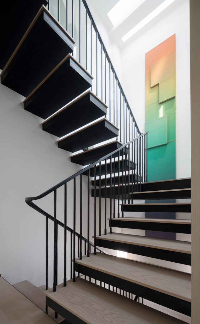 空间与环境,与人文的关系搭建,都藏着设计对人的精神与世界碰撞的关系表达。楼梯间选取一幅绢布艺术画的装饰,贯通于挑空,光与色的复合书写,成全时间流转的变幻魔术。