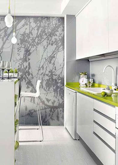 绿色同样能给空间带来清爽的感觉,苹果绿色的台面与白色橱柜的搭配给人清新视觉体验。用写意的风景画作为厨房边的背景墙设计,让厨房少了几分世俗,多了几分清雅。