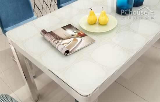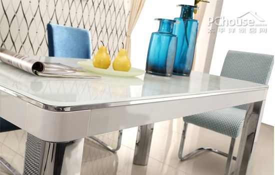餐桌面板采用钢化玻璃,框架采用了不锈钢架固定,从侧面看也是充满时尚感,光泽透亮,圆角的转角位更是贴心设计。