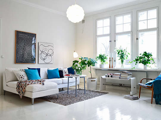 编辑点评:设计师采用纯白的L型沙发,不仅舒适方便,而且占位少,节省空间。再配上灰色地毯和绿色盆栽,整个空间显得优雅大方。