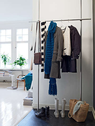 编辑点评:在入门处放置吊杆式衣架,除了挂置衣服外,底下还可以放鞋子包包等,方便主人的同时还提高了空间利用率和收纳功能。