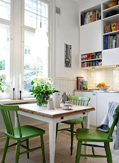 编辑点评:绿色的椅子和桌上的盆栽为空间注入活力,同时还和木质的桌子相呼应,展现空间独特的自然色彩。墙壁上的非主流设计又有美化墙壁的作用。