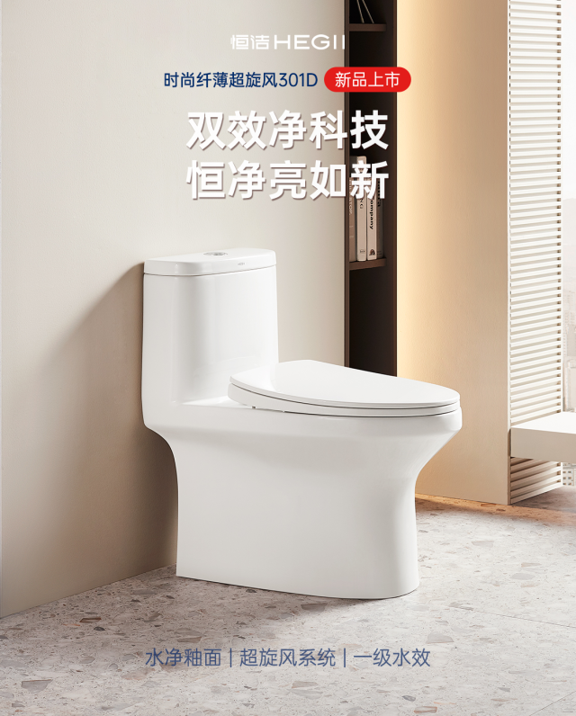 超旋风是恒洁独有的专利技术,超旋风强劲冲刷效果为千家万户所认可。本次全新超旋风系列新品301D不仅有超旋风专利技术,还融入了恒洁水净技术全新釉面技术,4层细腻釉面,5000目电镜下平滑润泽,表面包裹亲水釉面,水珠着壁成衣,沁入污渍底部,真正彻底清污。301D单位水量的冲刷效果更优异,不仅一次冲水只需3.5L,相比普通马桶节省40%的耗水量,在水净釉面的加持下,脏污难以附着,一次就能冲净。双效洁净设计,强强联合,让马桶恒净亮如新。