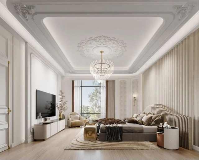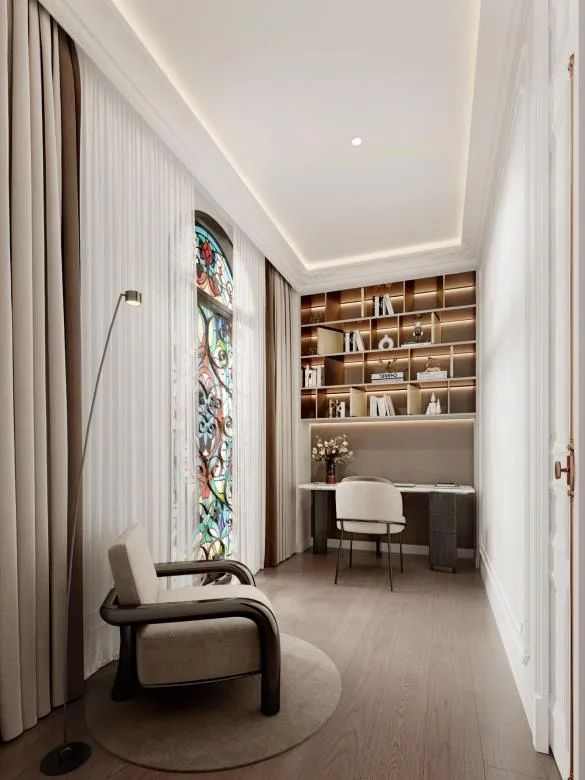 圆拱开窗,是法式的经典意象。客厅两面皆景,视野所及处是庭院自然的四时变幻,设计师以圆弧与几何的叠加形态构就客厅的观景框,诠释内外无界的艺术之美。圆顶天花在灯带掩映中层次分明,晶莹片羽游弋其间,与大理石材质的壁炉形成宁静的氛围观照。