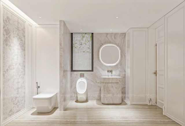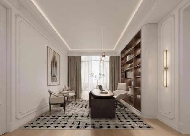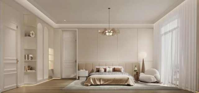 主卧格局轩朗,动静分区符合居者的日常起居习惯。无干扰的休憩区邻窗而设,设计师以温润素简的主色铺叙优雅格调,让材质与色彩的品质美学诉诸于人的感官知觉,舒适而大方。书房、卫浴空间的配套设置,既是功能的规划,亦是生活仪式感的锦上添花,设计上突出时尚的尺度与艺术的乐趣。