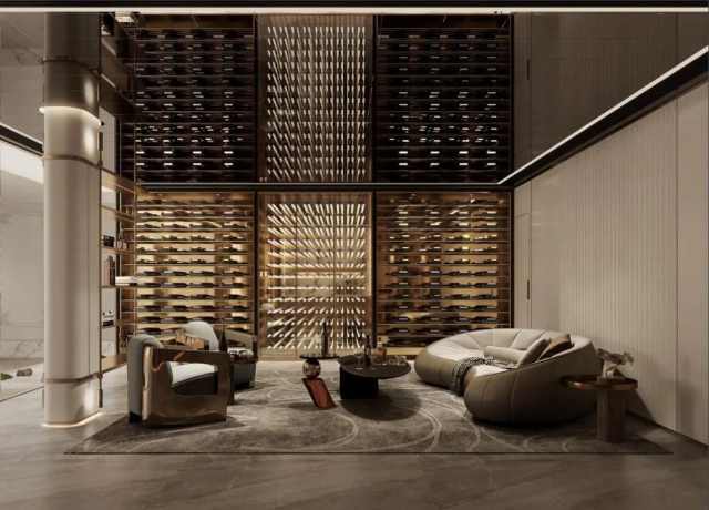 地下酒窖,是主人的藏酒空间,亦是圈层交流的会客空间。金属材质的酒架,加之隐藏灯带映照出颇具韵味的秩序感,成为空间的视觉中心。与此同时,镜钢材质的天花延展出空间的纵深感,人的活动中心则围绕着沙发,在醇香之中彼此交流。