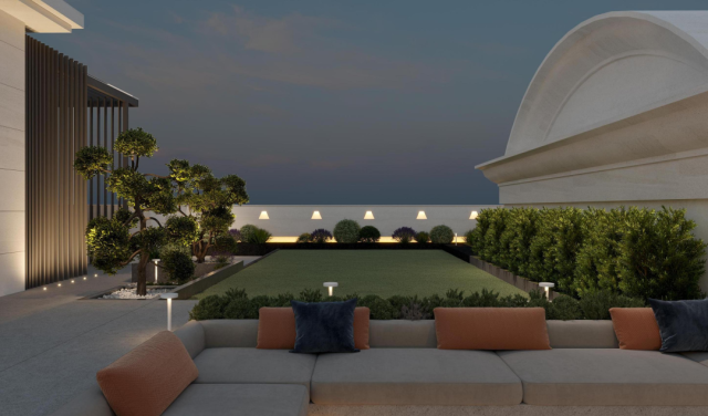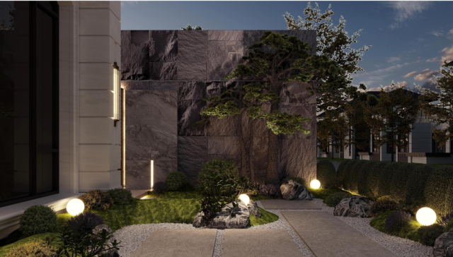 绿苔沙石、汀步流泉、星灯露台......当夜幕降临,顶层花园笼罩在花木摇曳的诗意光影之中。设计师不仅规划顶层花园的景观,同时将生活方式植入其中 —— 下沉沙发座区为围炉观影而设;顶层吧台对月小酌十足惬意;星灯露台是户外烧烤的绝佳地,家人共聚,亲朋同乐。
