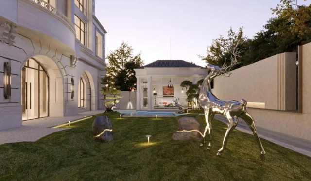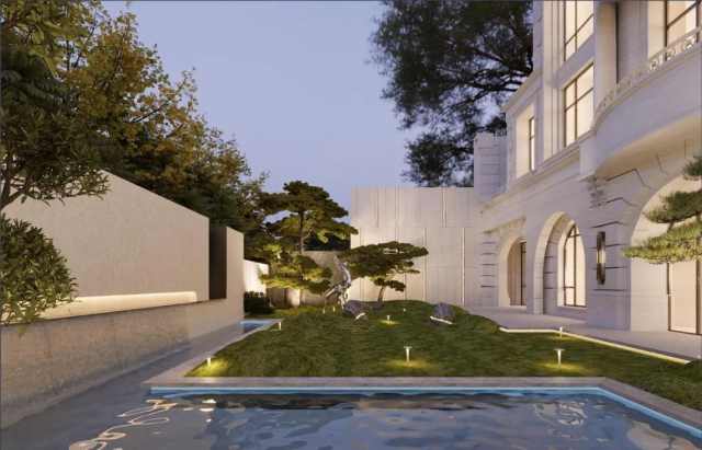 万城设计认为,景观之于豪宅的意义,不在于创造出经过美化的自然,而是与自然营造出建筑四周的新生态 —— 建筑之形与景观之意深度融合,共同为休闲生活提供框架。曲水小亭、绿坪松景、鹿伫缓坡,设计师以克制的留白手法造景,让纯白的建筑屹立于庭院的四时意境之中。