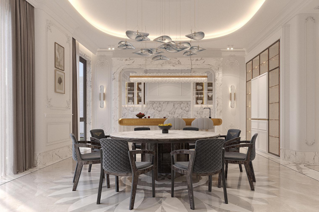 餐厅是生活艺术的日常再现,开放式餐厨空间带来近距离的互动场景。墙饰雕花与大理石纹路相映成趣,充盈了细节上的美感,强化品味卓然的空间意向,共同演绎当代生活的烟火气。随手推门入园,生活与自然无界衔接,和谐共处。
