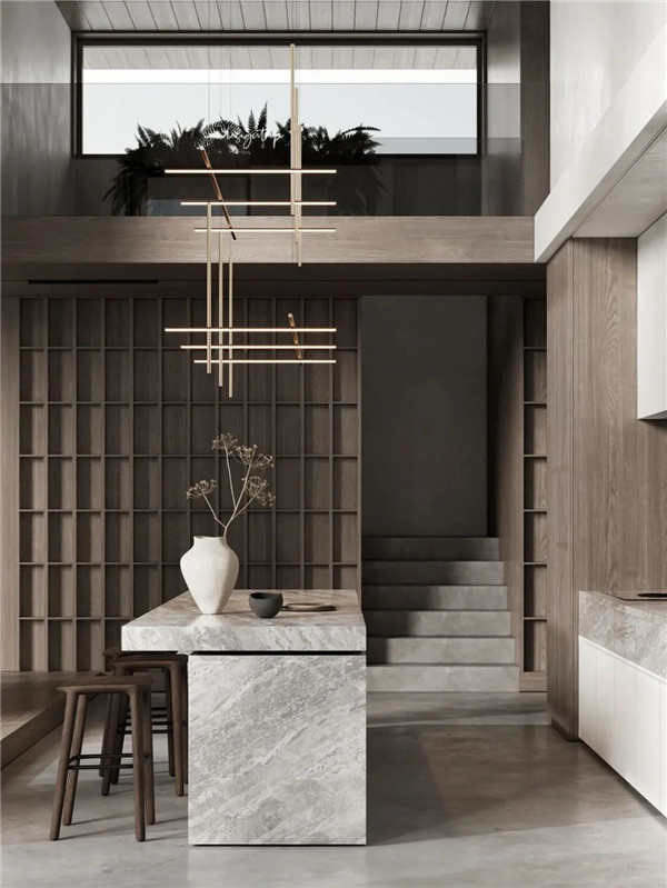 本案用灰色的自然反璞色彩系统作为空间的主色,同时融入一点中式的宁静之美,注重情感和氛围的渲染,创造出静谧质朴的舒适。