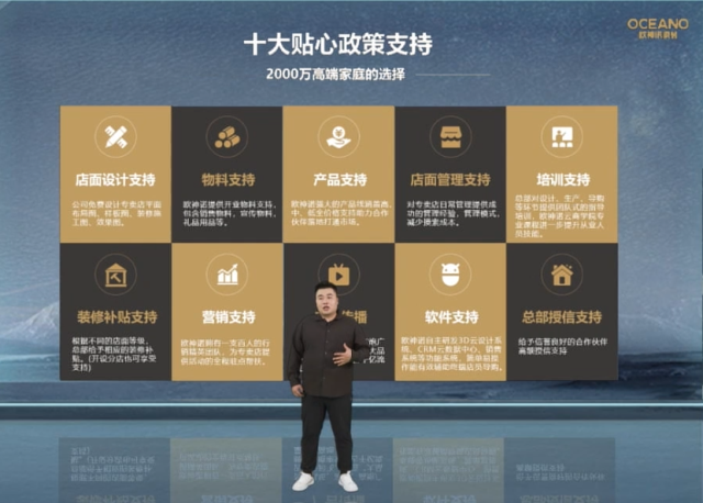 选大牌,赢未来。2022欧神诺瓷砖财富招商峰会落幕之际,欧神诺招商部总监满登辉为大家展示了激动人心的加盟福利。由十大政策支持出发,深度讲解多项招商政策和专属优惠,以及举办多场活动、大额补贴,扶持终端经销商的专卖店建设;提供谈单系统、线上学习神器、导师24小时在线帮扶、开业活动驻店、免费设计展厅、强大全线产品等专业的运营支持;总部、到店、线上、区域等诸多的终端培训支持。向大家展示如何帮助经销商解决运营、盈利难题,赋能经销商快速实现业绩提升。