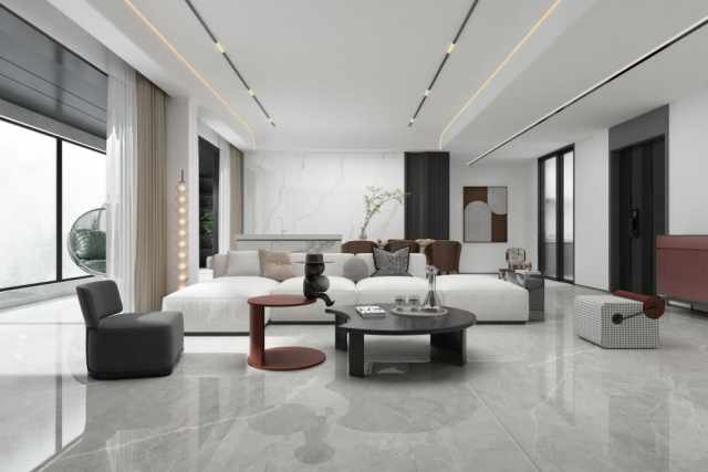 客厅地面铺贴灰色系岩板,素洁的肌理,简约的色调,呈现出侘寂风的宁静之美。纯白的沙发和白色岩板背景墙的组合,营造崇尚自然、追求质朴的意境和韵味,赋予空间舒心本真的格调与氛围。超大的落地玻璃窗,让明亮的光线提升空间的质感,增加整体的通透性。