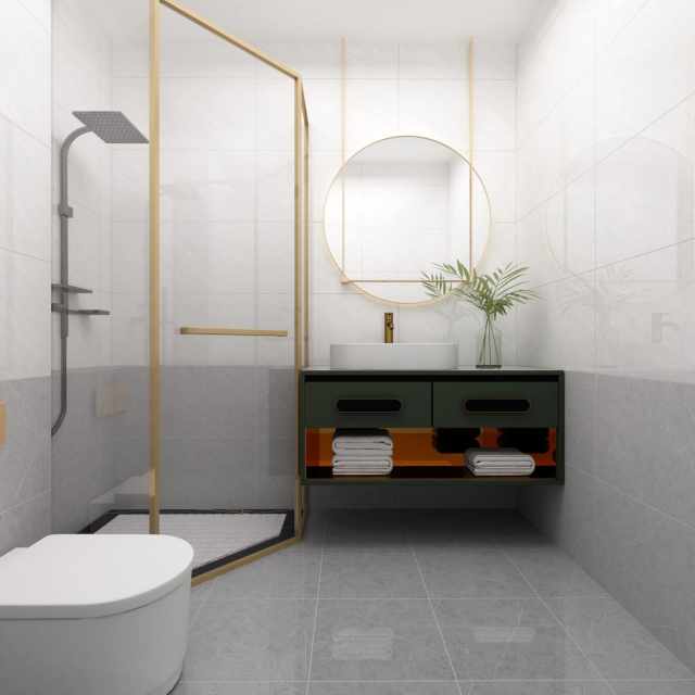 大版面的岩板上墙,整体花色让卫生间的设计更具张力,营造非凡的视觉体验。灰色和绿色的组合,深受年轻人喜爱,彰显时代的审美,以个性潮流的美学赋予空间艺术感。