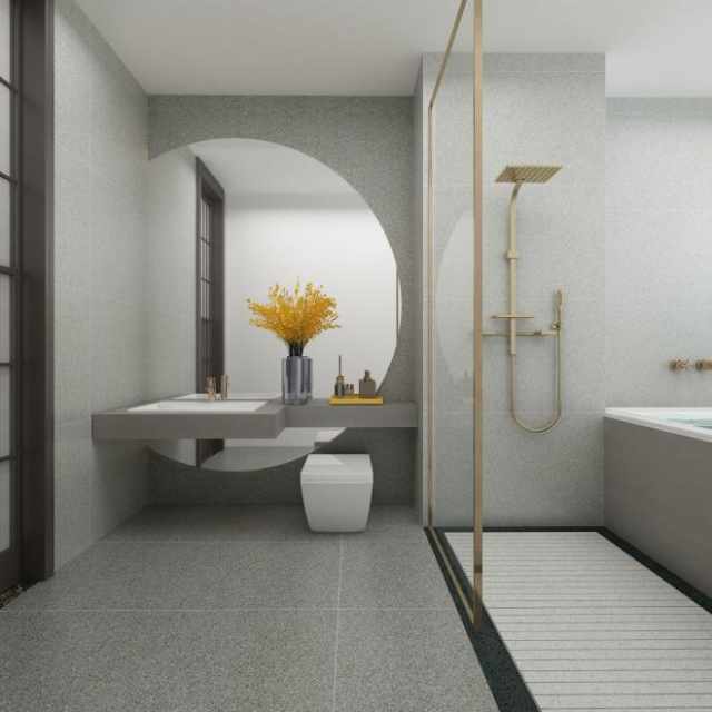 卫浴间采用墙地一体化空间设计,相同色系或纹理的岩板上墙下地,营造整体化的空间,带来极具冲击力的视觉效果,提升卫浴生活体验。