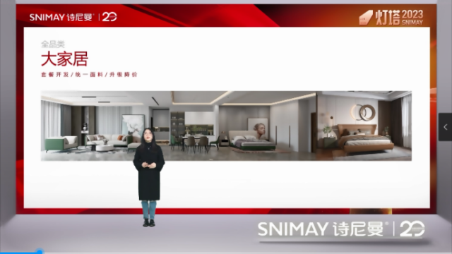 诗尼曼家居研发中心产品规划经理谭映,以“产品全·新计划”为主题,围绕着全渠道、全梯度、创新工艺回顾梳理了2022年产品开发逻辑,针对消费需求进行套餐型开发,及改善型开发”,从价格梯度上对产品体系进行了更全面的补充;在深度剖析市场、挖掘客户需求、研究客群居住需求后,她认为品类将会被重塑;展望2023年,未来诗尼曼将进一步加大研发力度,产品维度将延着用户导向,从产品品类,向产品+服务延伸,真正夯实一站式整家定制;与此同时,将基于定制核心业务作产品组合,将以更精细的开发新品,更全面的品类融合,更多样的套餐整合,帮助经销商差异化抢占市场。