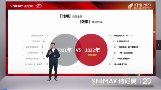 时间就是金钱,效率就是生命,数字化始终是链接生产、设计、终端的关键所在。诗尼曼家居信息中心CRM经理林毅滨则用1键报价、2防机制、3好原则、4缸增效总结高效赋能门店经营的2022,通过牵手酷家乐实现云端快速报价,方案到价格到,实现平台贯通,实现效率翻倍;展望2023,诗尼曼信息中心则将数字升级对准客户维护,围绕着客户跟进,进行高效而精准的数字服务,为门店提供有效的支持;