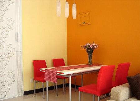 餐厅的桌椅与橙黄色的背景墙相映成趣