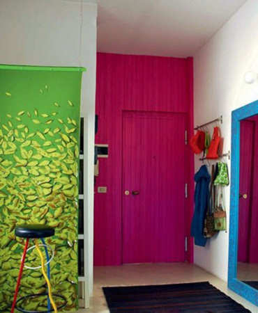 大门,采用了鲜艳夺目的酒红色,给人一种热情而奔放的感觉。对应内里一点的墙壁,则有点墙绘的意味,看多姿多彩的鲜绿色,犹如野外的一道亮丽绿叶般在家里绽放。