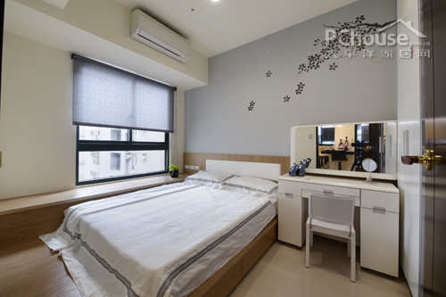 4、主卧沿墙面打造大型衣柜;从阳台划分了一个小空间摆放梳妆台或书桌椅。