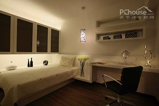 3、孝亲房空间小,挪动墙面向相邻的小孩房借用空间摆放衣柜;因此形成小孩房的入口玄关,小孩房采用榻榻米形式节省空间。