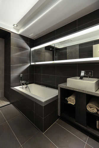 编辑点评:运用石材砖面铺排一室质感人文,采取不规则尺寸裁切的阵列拼贴,沉稳内敛却不失个性。