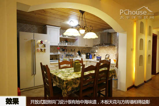 编辑点评:木板天花吊顶是厨房设计的亮点,格栅师吊顶木质纹理很有质感,用小方砖铺设整个背景墙,营造温馨的空间环境,整个厨房显得干净利落。为弥补空间不足,餐厅借用了部分过道空间,而拱门设计正好解决餐厅门梁高度不足问题。