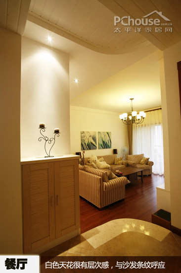 编辑点评:白色的天花吊顶很有层次,圆弧线条设计向客厅借用了部分空间,功能区过渡更加顺畅,有层层递进的视觉效果,向上不断拉伸空间,条形天花板与客厅条纹沙发相呼应。实木地柜做收纳贴合墙面,丰富空间收纳功能。