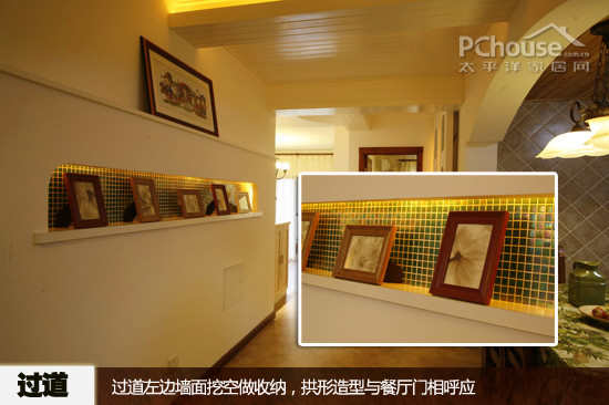 编辑点评:设计师挖空左边墙面作为收纳摆设功能,收纳空间有层次递增的感觉,同时与厨房拱形门相呼应。过道木板天花设计,可弱化过道横梁,增加居室美感,同时白色天花板视线很光亮,有拉伸空间。