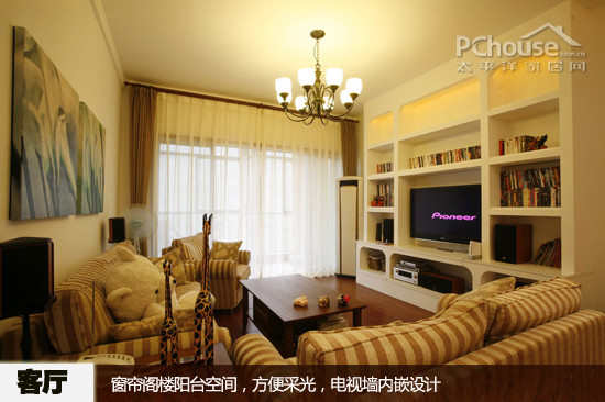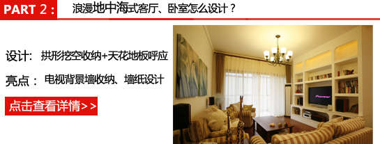 编辑点评:电视背景墙收纳功能是最大亮点。将整个墙面设计成嵌入式电视柜,摈弃突兀感,采用地中海式拱形挖空设计,利用墙面空间,节约了客厅的空间。