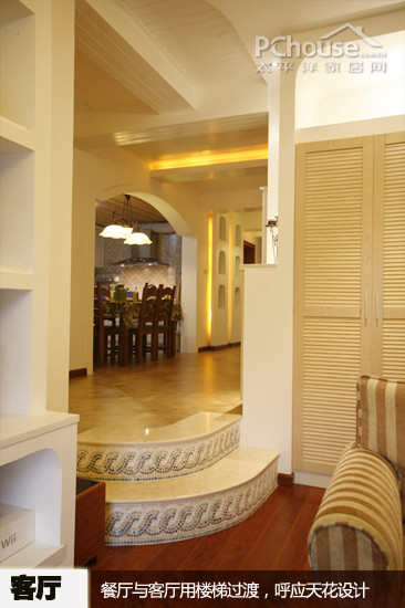 编辑点评:客厅与餐厅之间采用地中海拱形楼梯过渡,与天花错层设计相对应,通过错层的方式设计成通透的大空间效果,增添了布局的豪华感,同时将潜在的空间充分地释放出来。