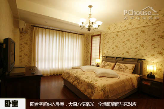 编辑点评:为了弥补卧室空间不足,设计师拆掉阳台转变为卧室空间,采用落地大窗户设计增加卧室采光。低矮的实木床头柜等地中海元素巧运用,配合全墙纸设计,解决横梁突出的问题,打造浪漫地中海卧室。