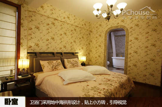编辑点评:卧室卫浴间是设计师根据户型特点增建的,拱形设计配以小方砖贴合引导卧室空间视觉,无门开放式设计可有效延伸卧室空间。