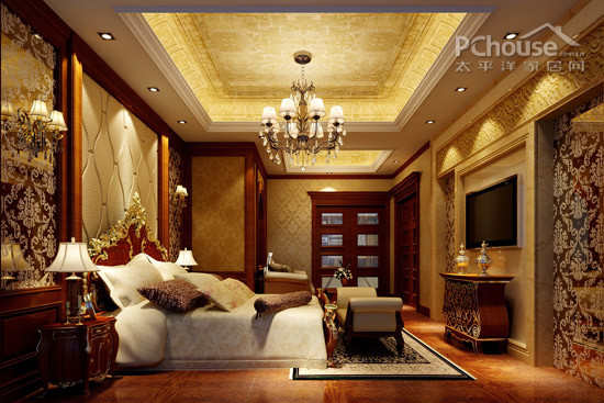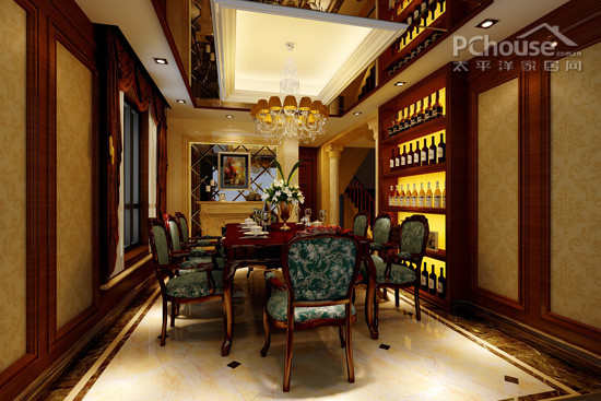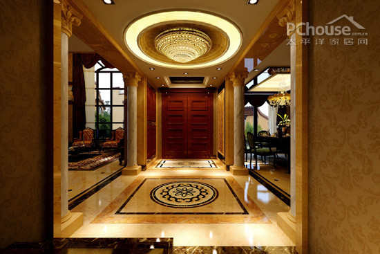 设计说明:本案强调以华丽的装饰、浓烈的色彩、精美的造型达到雍容华贵的装饰效果。欧式客厅顶部用大型灯池,并用华丽的枝形吊灯营造气氛。门窗上半部多做成圆弧形,并用带有花纹的石膏线勾边。入厅口处竖起两根豪华的罗马柱,墙面用壁纸,以烘托豪华效果。地面材料以石材为主。深色的橡木家具,色彩鲜艳的布艺沙发,都是这套案例的主角。