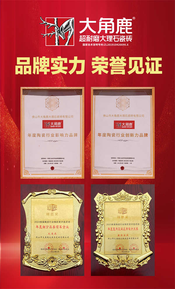 超耐磨大理石瓷砖发明者——大角鹿拥,有超七成超耐磨国家发明专利技术,耐磨度达4级以上,耐磨度比普通瓷砖高出3倍,是耐磨度全球第 一和超耐磨发明专利数量第 一的瓷砖品牌。