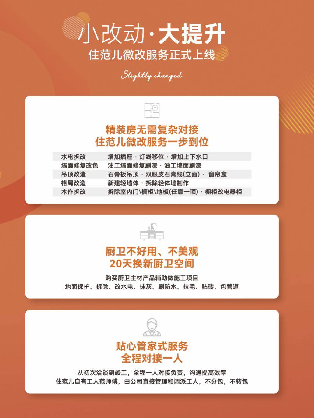 基于精装房交付场景和用户验房、局改、定制、家具家电的一揽子需求,住范儿聚焦精装改造市场,新推出了“全+整屋软装套餐”和“微改造”服务,想要成为业主身边的装修界的“盒马鲜生”。
