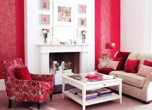 红色的印花壁纸,图案的装饰效果更加突现,红色、米色沙发让客厅彰显出主人的热情。