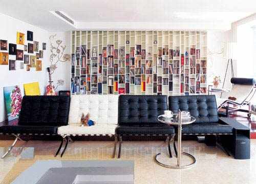 不规则形状的客厅设计,沙发和茶几也是小型的哦,整体的墙面都是书柜,白色的墙面清爽大气,很喜欢这样温馨的客厅。